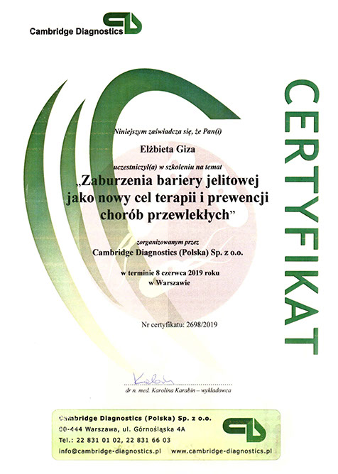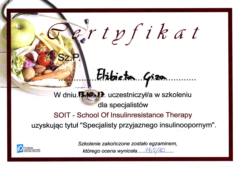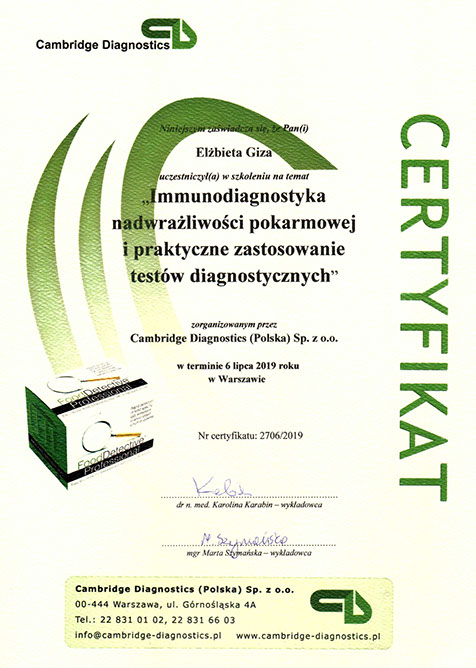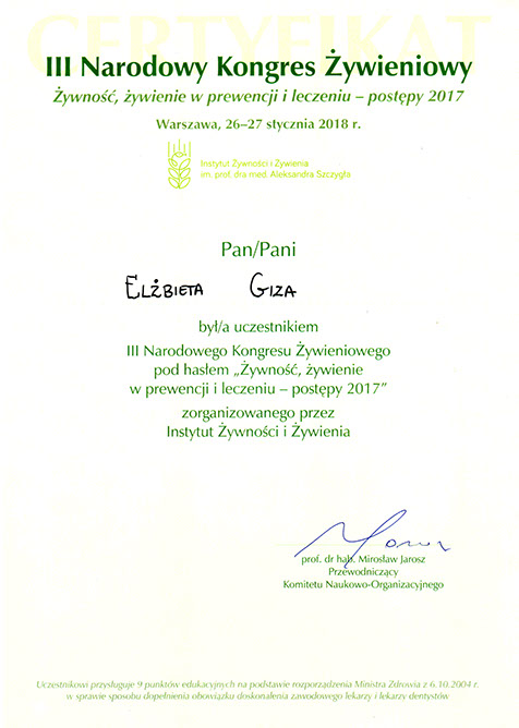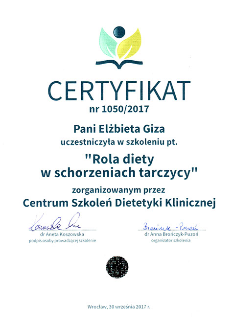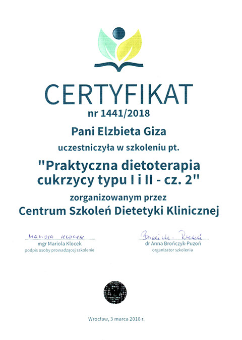 Specjalistka w zakresie dietetyki oraz technologii żywności i żywienia człowieka od roku 1997.