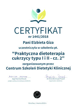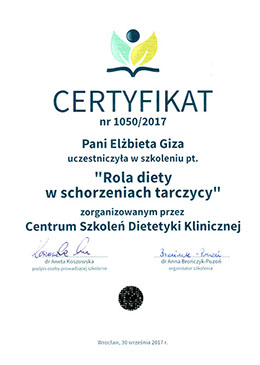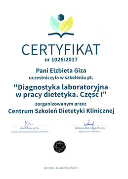 Specjalistka w zakresie dietetyki oraz technologii żywności i żywienia człowieka od roku 1997.